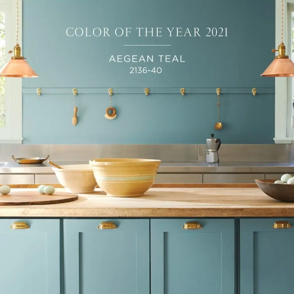 Aegean Teal is a sensible choice for Benjamin Moore’s Color of the Year. As an earthy tone, this color offers a serene, quiet sense of purpose. It is vibrant, yet soothing. We recommend using this color for cabinetry if you don’t wish to paint an entire room or use it as an accent color on a wall or in a small room. Alternatively, you can consider using it as an accent color for a living room or a bedroom with a tabletop accent – have fun with teal accessories such as placemats, coasters, or glassware.